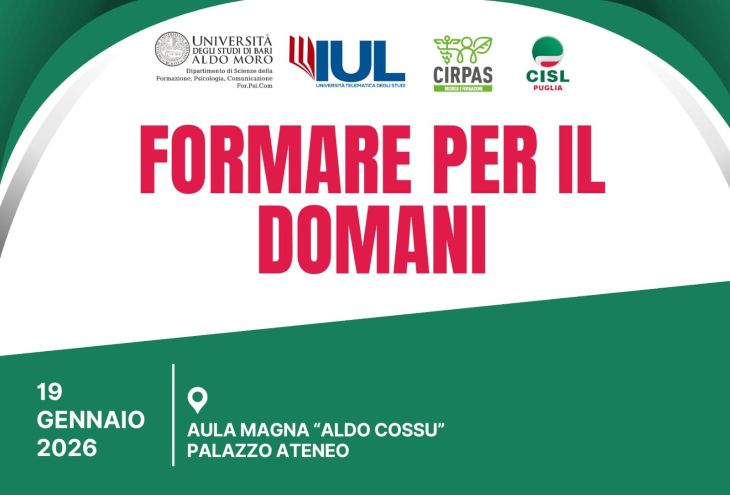 Si terrà lunedì 19 gennaio, presso l'Aula Magna "Aldo Cossu" di Palazzo Ateneo dell'Università degli Studi di Bari, il convegno "Formare per il Domani". L’evento, promosso dal Dipartimento di Scienze della Formazione, Psicologia, Comunicazione metterà al centro del dibattito i temi cruciali delle competenze, dell'occupabilità e delle nuove frontiere del mercato del lavoro.