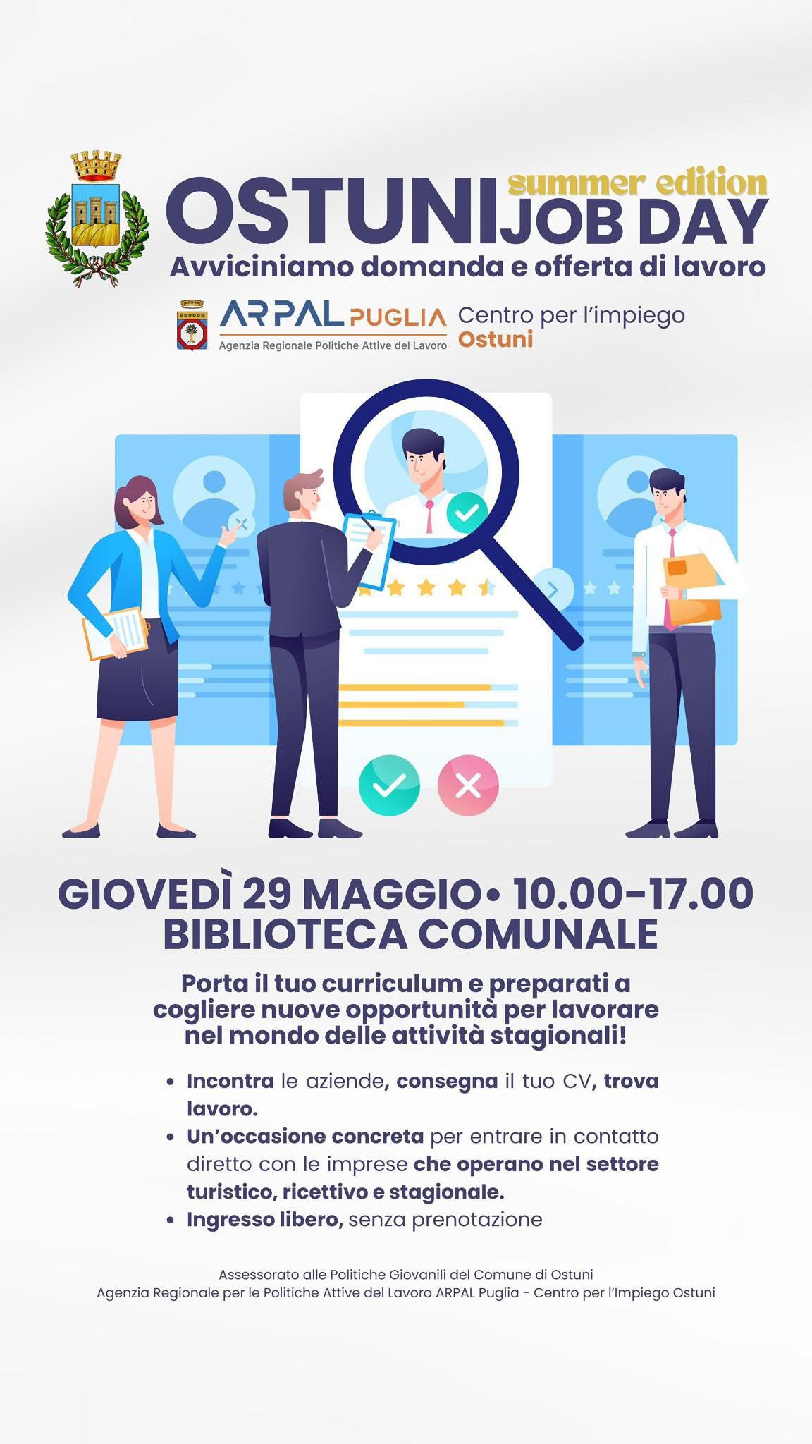 Dopo il grande successo dell’”Ostuni Job Day”, ARPAL Puglia - Centro per l’impiego di Ostuni e l’amministrazione comunale di Ostuni presentano la I edizione dell’ “Ostuni Job Day - Summer Edition”, un Job day dedicato alle attività stagionali. L’iniziativa è promossa dal Centro per l’Impiego di Ostuni – ARPAL Puglia e dal Comune di Ostuni, attraverso l’Assessorato alle Politiche Giovanili, e rappresenta una nuova occasione concreta per facilitare l’inserimento lavorativo, soprattutto per i giovani e per chi è alla ricerca di un impiego nel breve periodo.