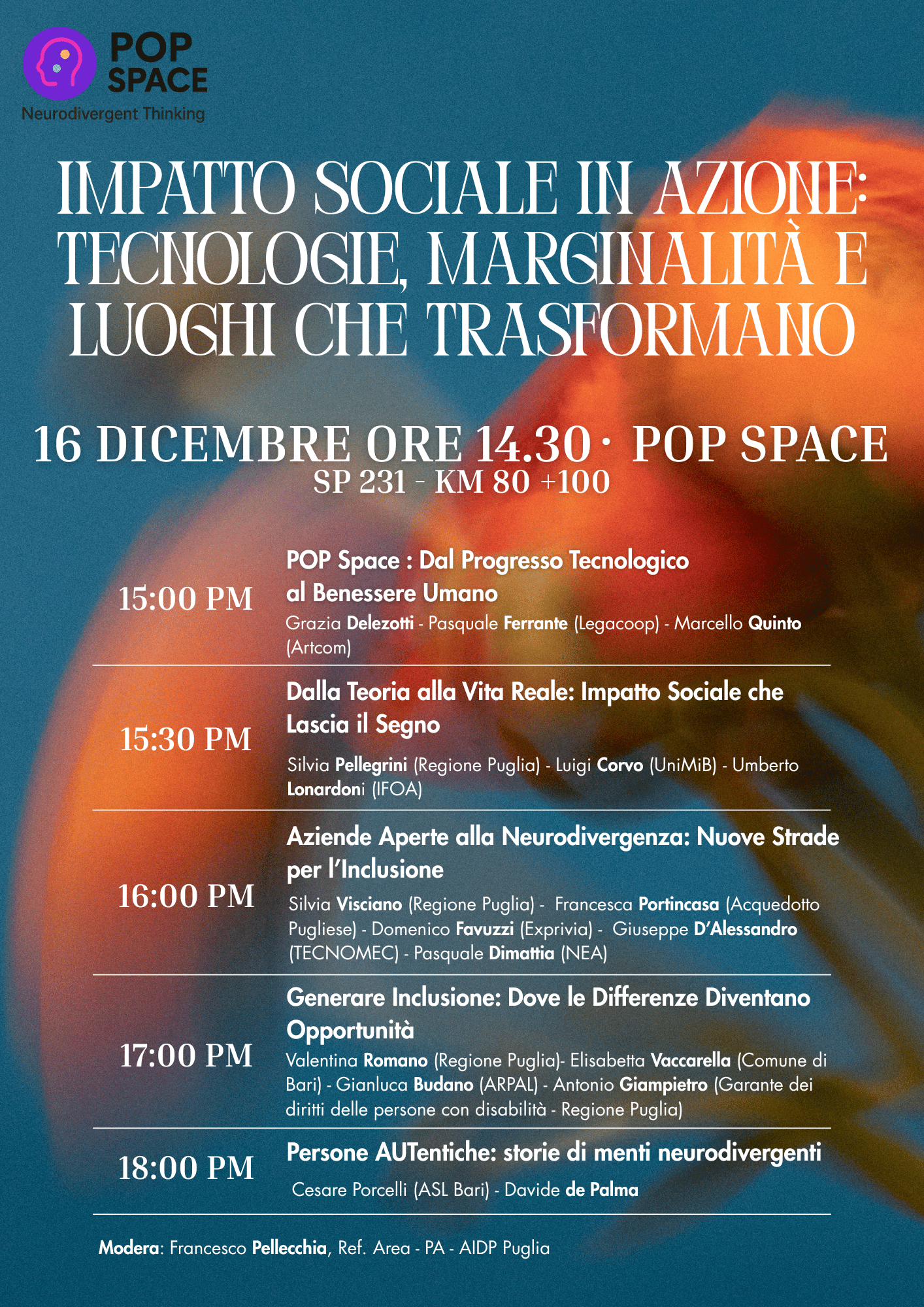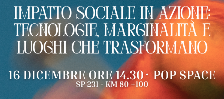 I temi dell’impatto sociale, dell’innovazione tecnologica e dell’inclusione lavorativa delle persone neurodivergenti saranno al centro dell’incontro “Impatto Sociale in Azione: Tecnologie, Marginalità e Luoghi che Trasformano”, in programma martedì 16 dicembre alle 14:30 presso POP SPACE, situato sulla SP 231 (km 80+100).
